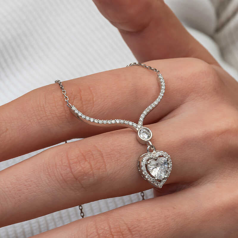 Gümüş Beyaz Zirkon Taşlı Kalp Kadın Kolye