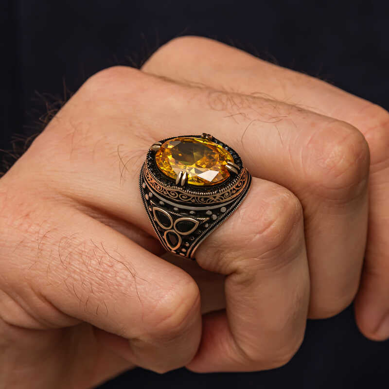 Gümüş Sarı Sitrin Zirkon Taşlı Erkek Yüzük