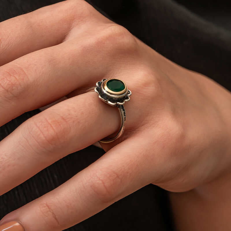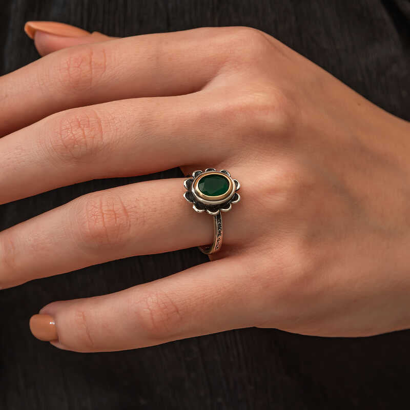 Gümüş Yeşil Çiçek Desenli Otantik Kadın Yüzük