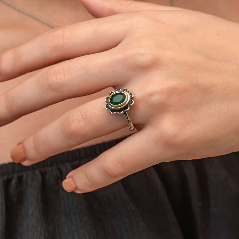 Gümüş Yeşil Çiçek Desenli Otantik Kadın Yüzük Yeşil çiçek desenli otantik yüzük geleneksel ve modern tarzları bir araya getirerek stilinize ikonik bir dokunuş katıyor.Hem bohem hem de klasik stillerle mükemmel bir uyum sağlar.Doğum günü hediyesi, sevgililer günü hediyesi veya annelere hediye olarak özel günlerde tercih edilebilecek mükemmel bir seçenektir.Gümüş yeşil...