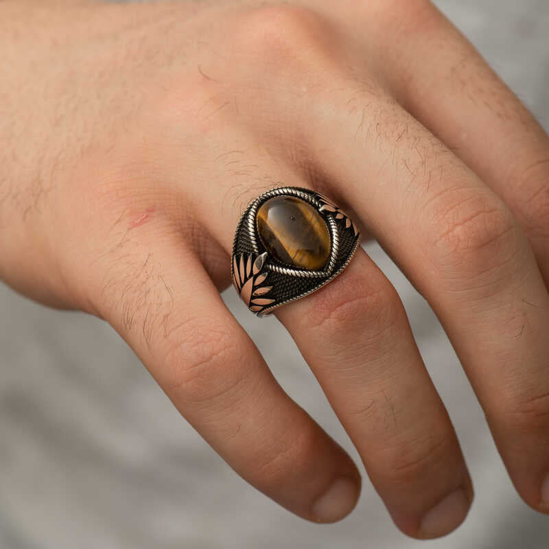Gümüş Kaplangözü Taşlı İşlemeli Erkek Yüzük