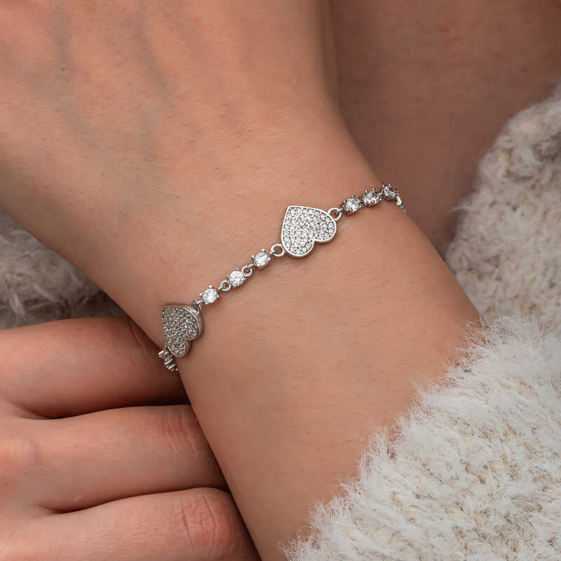 Gümüş Zirkon Taşlı Sıralı Kalp Kadın Bileklik