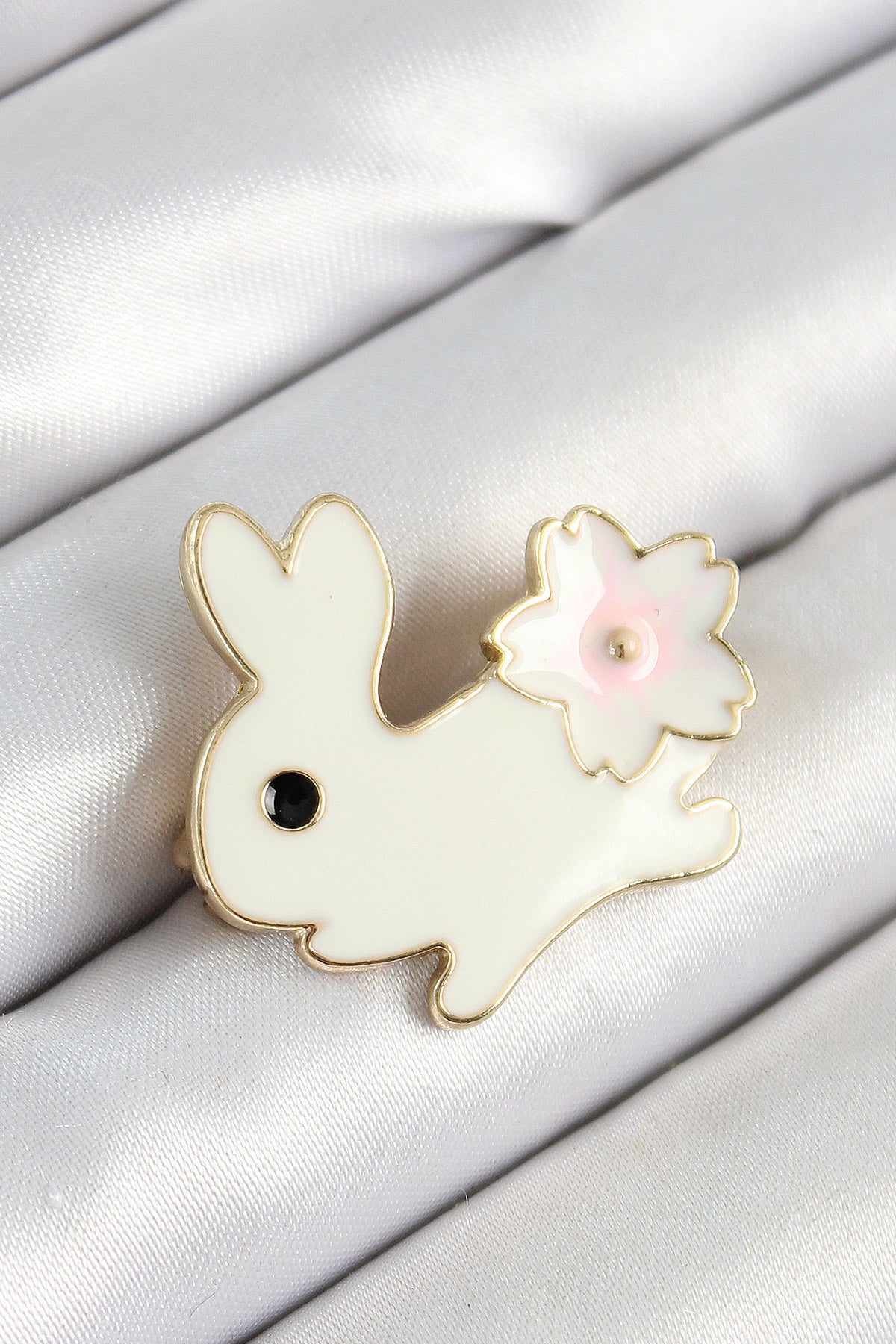 Mineli Çiçek Detaylı Krem Tavşan Figürlü Gold Renk Kadın Broş