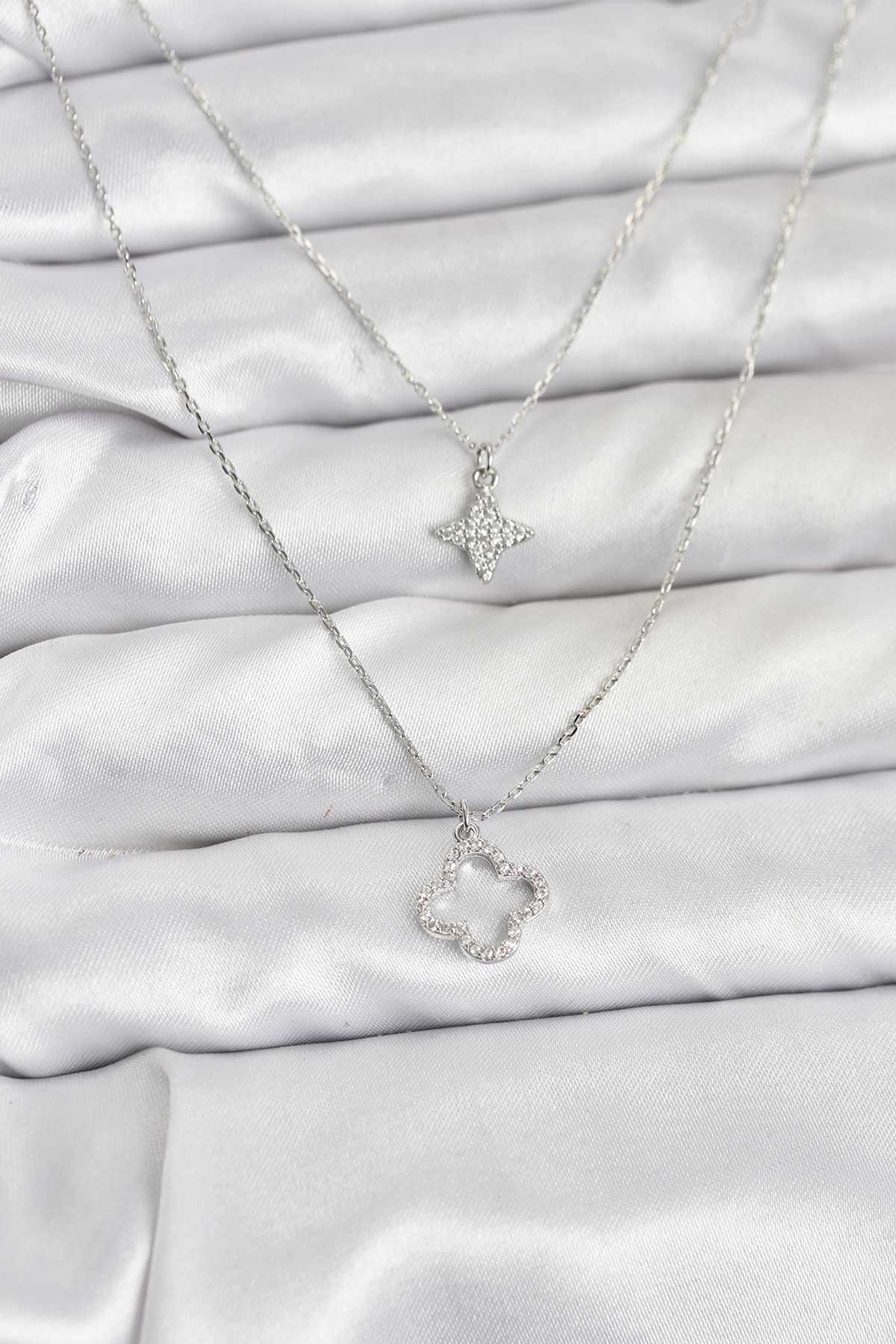 Pirinç Gümüş Renk Yonca Model 2'li Kadın Kolye